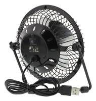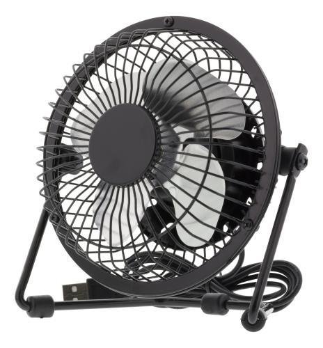 1. 5CFM. Vikt: 318 g Mått (BxDxH): 150x81x154 mm. Förpackningen innehåller: USB-fläkt USB-fläkt, 10cm, bordsmodell, 1x USB Type A ha, svart. USB-fläkt av bordsmodell med blad av aluminium.