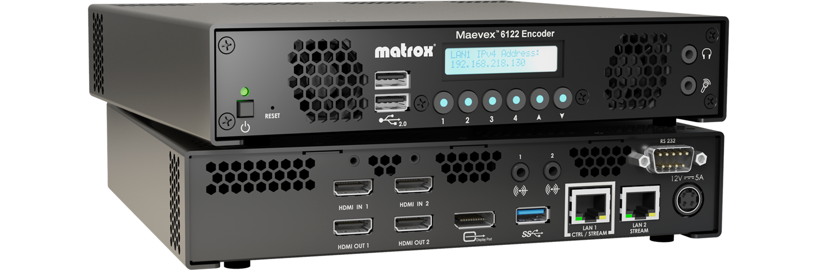 Matrox® Maevex 6122 is an HDMI® video encoder that delivers dual 4K capture, encode, stream, and record—with zero latency pass-through. The encoder supports multiple streaming protocols, including SRT and on-device HLS, for easy and secure streaming locally or across the world. Two Gigabit Ethernet ports allow for dual network streaming or separate networks for control data and video data. The complimentary Maevex SDK enables you to build new applications or integrate the functionalities of PowerStream Plus into existing applications.