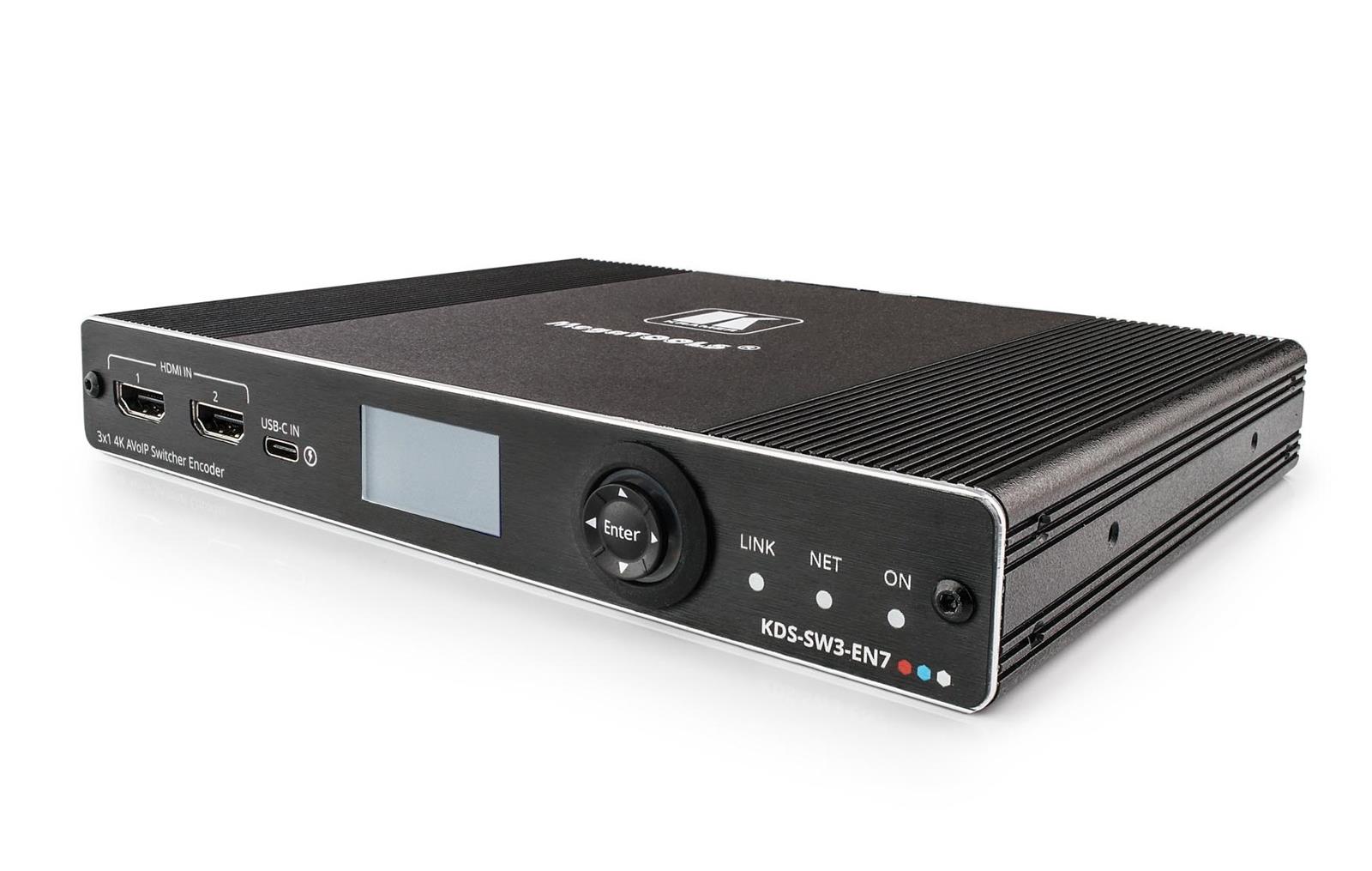 KDS−SW3−EN7 is an auto switcher and advanced encoder for streaming a selected video signal at 4K via Ethernet over copper cable in unicast (one−to−one) or multicast (one−to−many) configurations. It can add digital audio Dante, USB, IR, RS−232, or CEC signals.