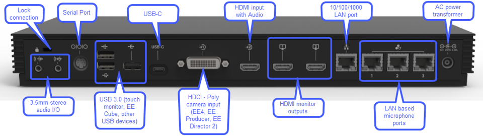 - Up to 4x Clink2 microphones or Soundstructure (using Poly Microphone IP Adapter)