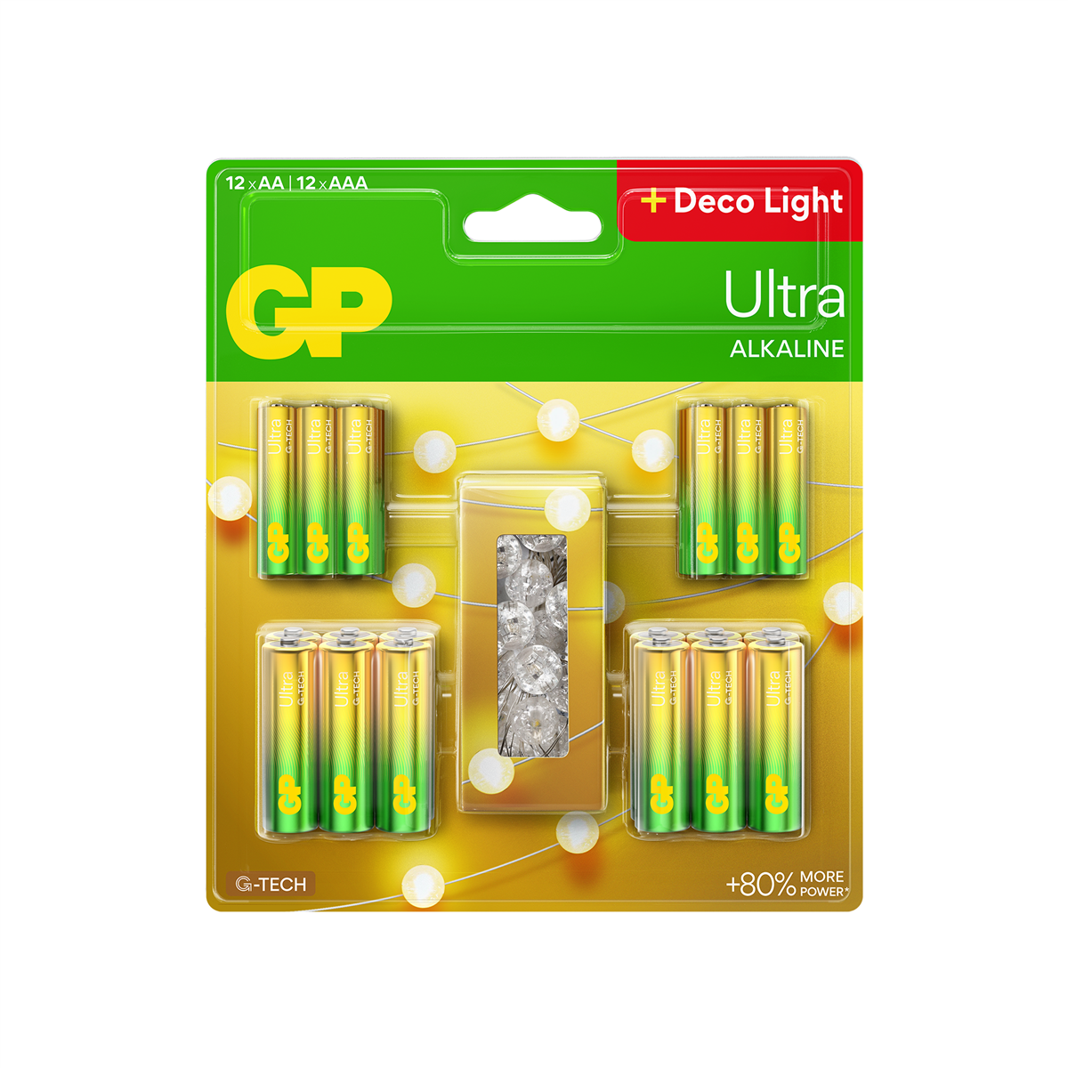 GP Ultra Alkaline 12xAA + 12xAAA Batterier + Ljusslinga
