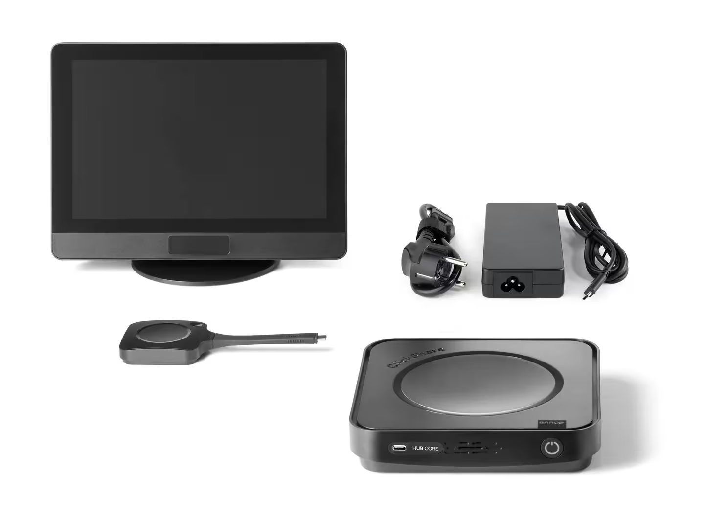 - ClickShare Hub Core Base Unit, 1 ClickShare Hub Button 5th Gen, Mounting disc, Safety manual, Quick setup guide, Control Panel, ClickShare 10M 20W USB-C AOC cable, L-Shape mounting plate, Round base, Screw pack, Quick setup guide, USB-C cable lock kit