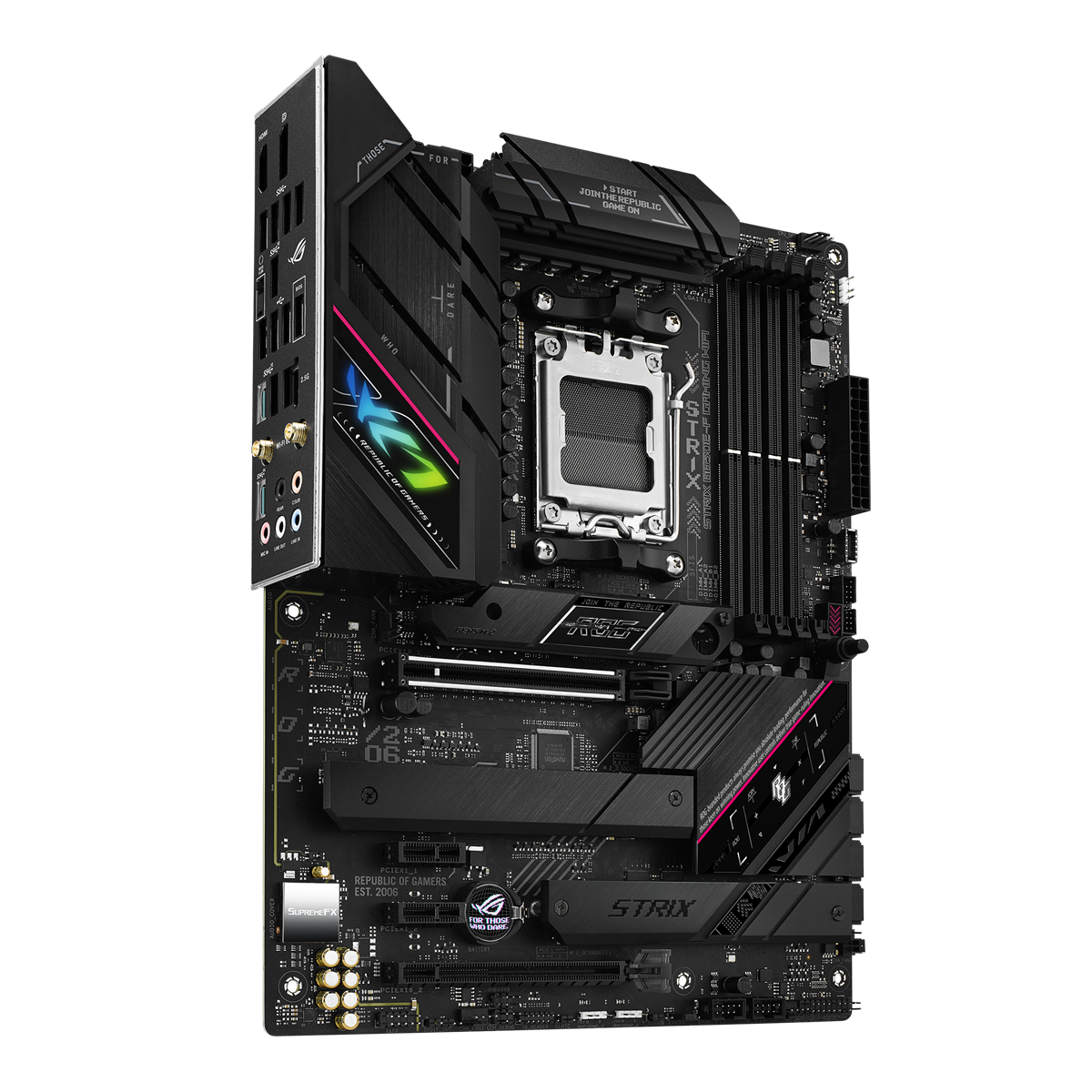 An overall dark aesthetic is accented with punchy brand-centric details and a logo that glows with fully-customizable RGB lighting. A meld of form and function is illustrated by a cut-out I/O shield, which allows additional airflow to pass through the VRM heatsink channels below. Pair the Strix B650E-F with other products from the diverse ROG ecosystem to create a fully customized gaming setup that reflects your personal style.